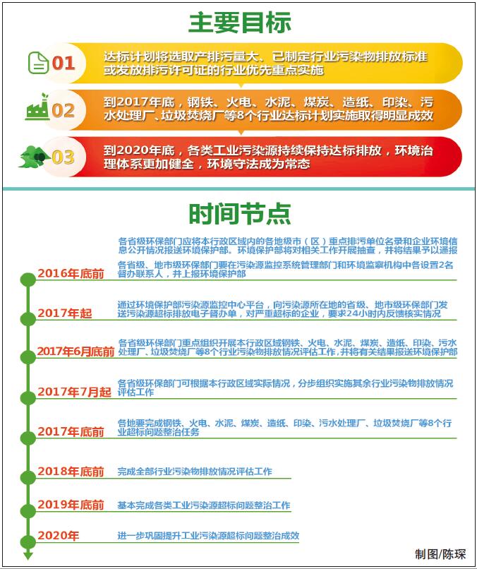 中国环境报记者童克难北京报道 环境保护部日前发布《关于实施工业污染源全面达标排放计划的通知》(以下简称《通知》),要求到2017年底,钢铁、火电、水泥、煤炭、造纸、印染、污水处理厂、垃圾焚烧厂等8个行业达标计划实施取得明显成效,污染物排放标准体系和环境监管机制进一步完善,环境守法良好氛围基本形成。到2020年底,各类工业污染源持续保持达标排放,环境治理体系更加健全,环境守法成为常态。