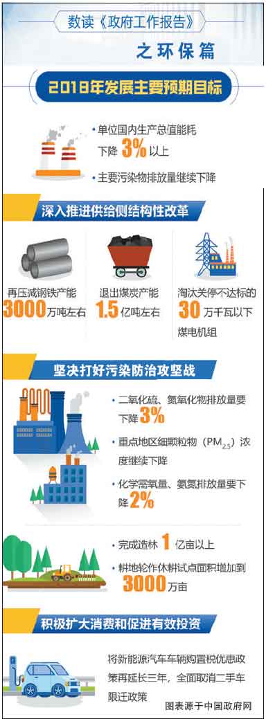 他强调,要坚决打好三大攻坚战。要围绕完成年度攻坚任务,明确各方责任,强化政策保障,把各项工作做实做好。推进污染防治取得更大成效。巩固蓝天保卫战成果,今年二氧化硫、氮氧化物排放量要下降3%,重点地区细颗粒物(PM2.5)浓度继续下降。推动钢铁等行业超低排放改造。提高污染排放标准,实行限期达标。开展柴油货车超标排放专项治理。深入推进水、土壤污染防治,今年化学需氧量、氨氮排放量要下降2%。实施重点流域和海域综合治理,全面整治黑臭水体。加大污水处理设施建设力度,完善收费政策。严禁“洋垃圾”入境。加强生态系统保护和修复,全面划定生态保护红线,完成造林1亿亩以上,耕地轮作休耕试点面积增加到3000万亩,扩大湿地保护和恢复范围,深化国家公园体制改革试点。严控填海造地。严格环境执法。我们要携手行动,建设天蓝、地绿、水清的美丽中国。